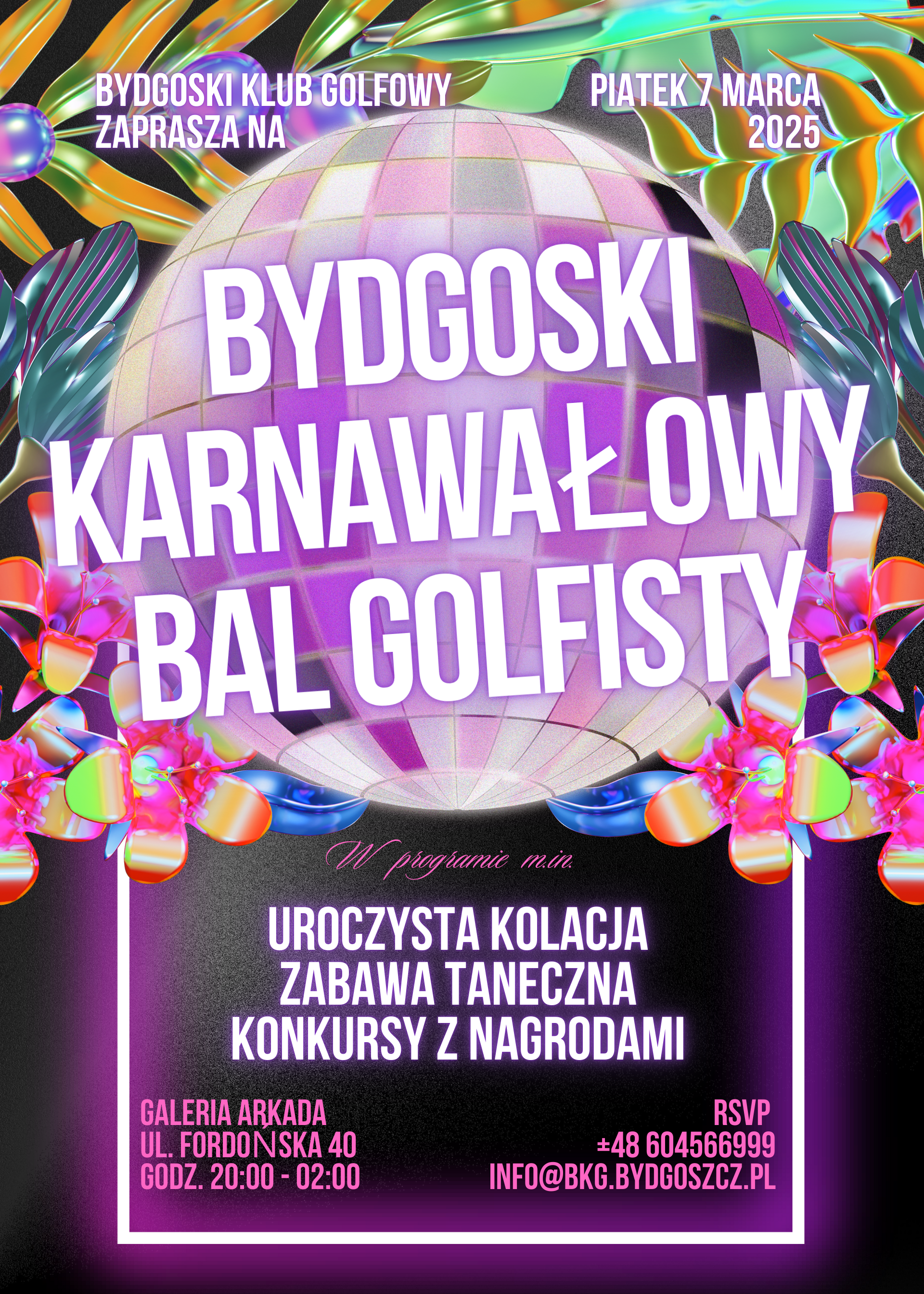 Zapraszamy na Karnawałowy Bal Golfisty, który odbędzie się w dniu 7.03.2025r. w Galerii Arkada przy ul. Fordońskiej 40 (sala bankietowa na I piętrze galerii).